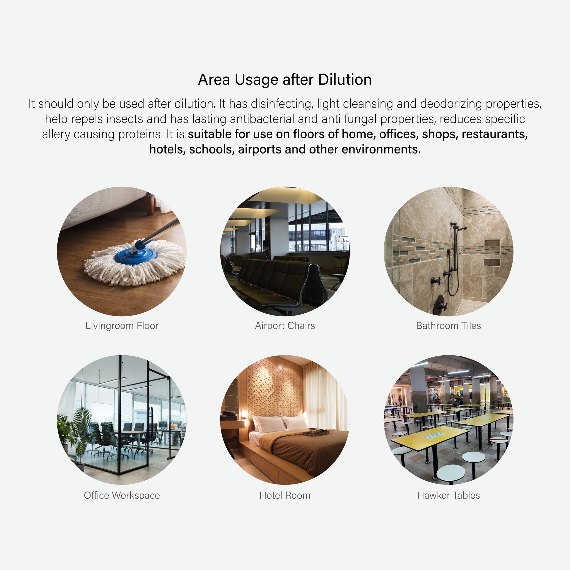 This product is a disinfecting floor cleanser concentrate and can only be used after dilution. After dilution, it is used for disinfection, bacteria inhibition, and the cleaning of floors. The product has disinfecting, light cleansing, and deodorizing properties; repels insects; has lasting antibacterial and antifungal properties; and also reduces specific allergy-causing proteins. The product's efficacy have been evaluated under the standards of EN1276-2019, EN1650-2019, ISO20743:2021, ASTM21-15(2021), ISO4333:2022 and etc. It is suitable for use on floors of homes, offices, shops, restaurants, hotels, schools, airports, and other environments.