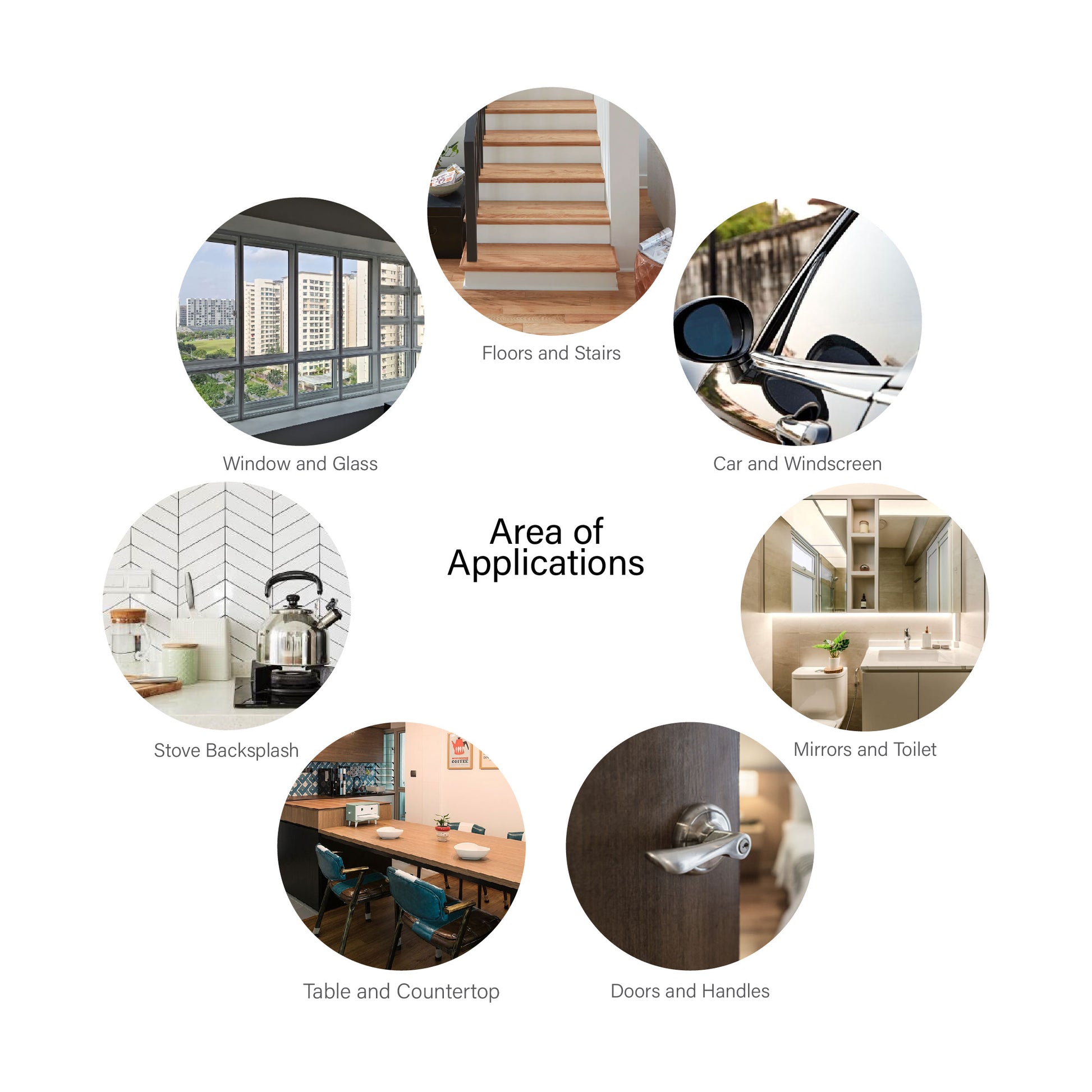 • Car Windows & Windscreens: Spray the cleaning solution onto the surface, scrub with the mop cloth, and wipe clean with the squeegee.
